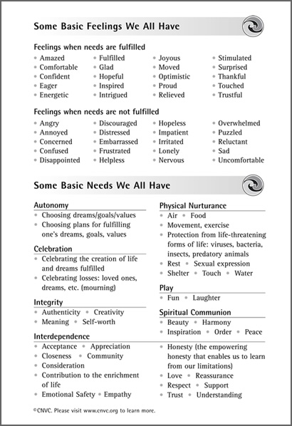 A list of basic human needs can be found both in Marshall Rosenberg’s book called Nonviolent Communication, and as well as online in various modified, updated or expanded NVC groups such as the list of needs emphasizing meaning and connection over integrity made in New York City. A basic premise in Nonviolent Communication philosophy is that too often we ignore our basic and needs and become preoccupied with the strategies we believe will fulfill them — while not even admitting we even have them — and that by recognizing our basic needs we can begin to live more peaceful and fulfilling lives.
